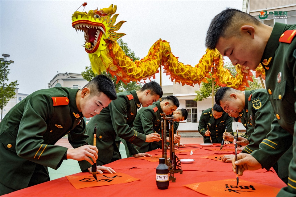 官兵們揮毫潑墨,書寫祝福。李笑仙 攝