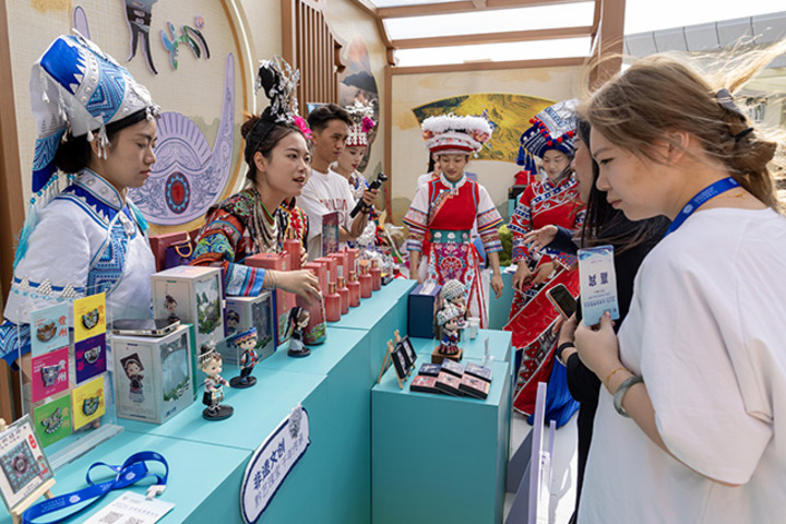 12月3日,在2025企業(yè)家博鰲論壇國民共“拾”光市集,參會嘉賓正在了解非遺文創(chuàng)。新華網(wǎng)記者 鐘奕攝