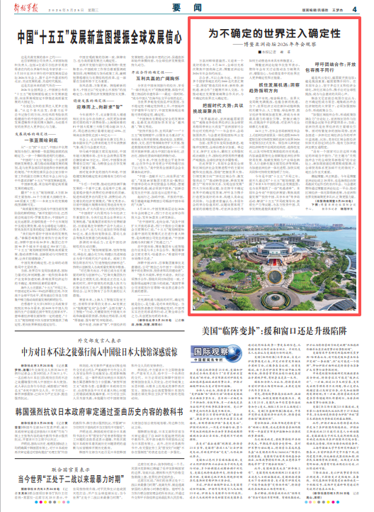 今年是中國“十五五”開局之年。前不久通過的“十五五”規(guī)劃綱要,擘畫了未來5年中國經(jīng)濟(jì)社會(huì)發(fā)展藍(lán)圖,也為世界提供了一份“機(jī)遇清單”。本屆年會(huì)專設(shè)“中國經(jīng)濟(jì)展望:聚焦高質(zhì)量發(fā)展”“投資中國,共享未來”等多場活動(dòng),解讀“十五五”開局政策導(dǎo)向、新質(zhì)生產(chǎn)力等議題,為各方投資中國、共享發(fā)展機(jī)遇提供重要平臺(tái)。