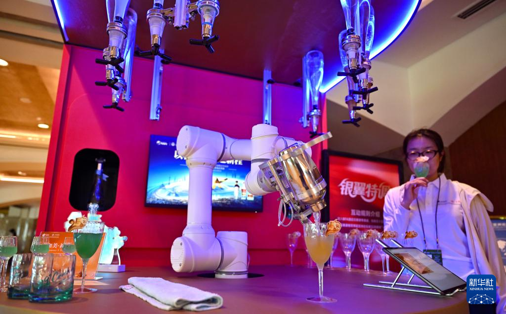 3月25日,一款調(diào)酒機(jī)器人在博鰲亞洲論壇大酒店為參會(huì)人員調(diào)酒。