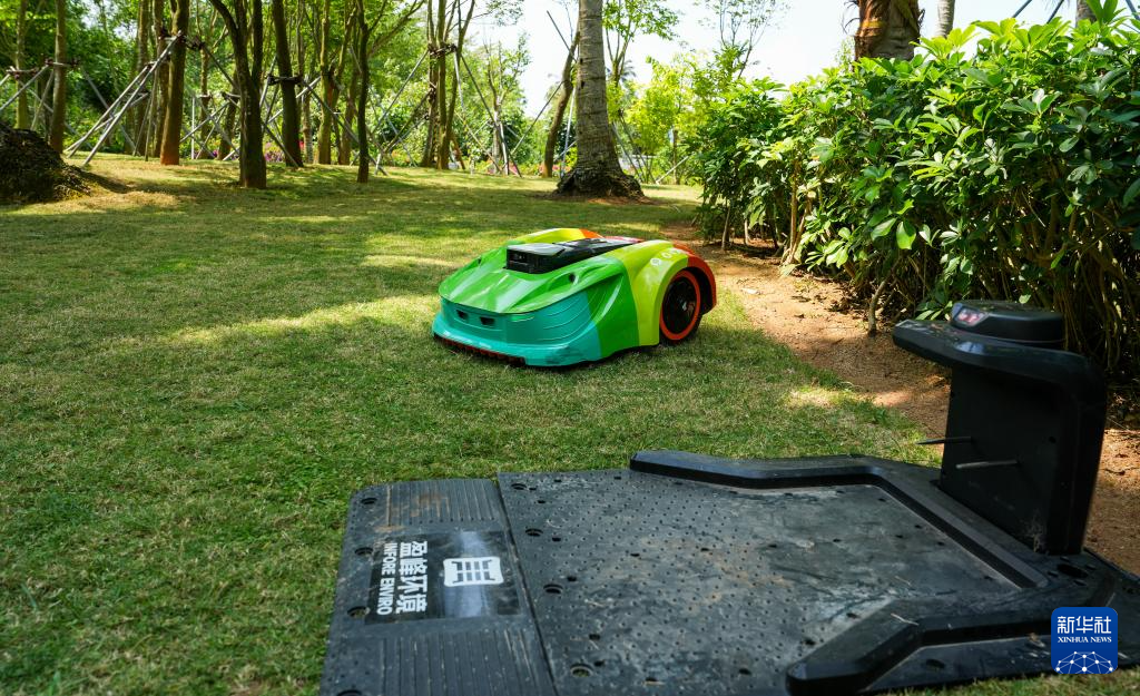 3月25日,智能無(wú)人割草機(jī)在中國(guó)(海南)南海博物館周邊草坪上作業(yè)。
