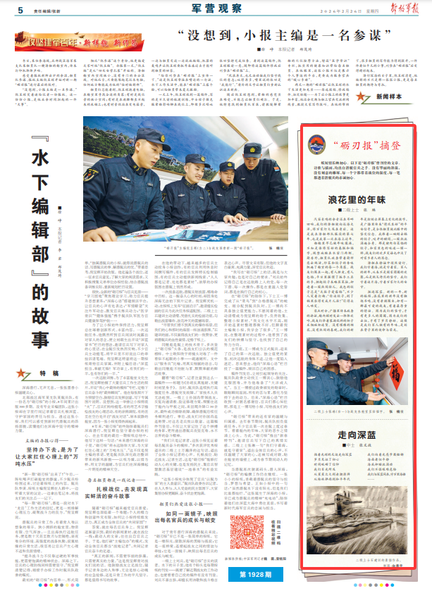 紙短情長映初心。以下是“礪刃報”曾刊登的文章、詩歌與插畫,均出自潛艇官兵之手。沒有華麗的辭藻,沒有刻意的雕琢,每一個字都帶著戰(zhàn)位的溫度,每一筆都透著潛艇兵的赤誠初心。