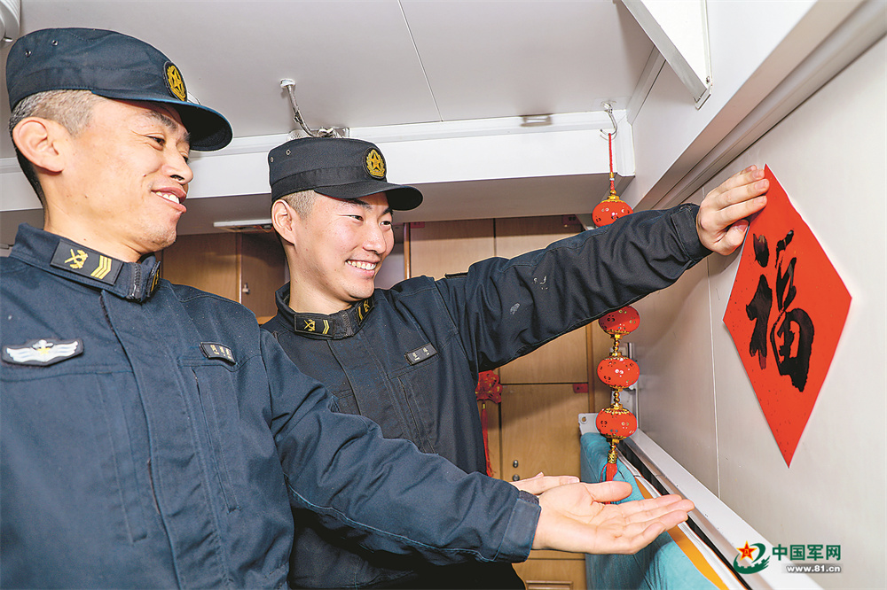 二級上士張琳(右一)與戰(zhàn)友在艙室里貼福字。張 楠攝