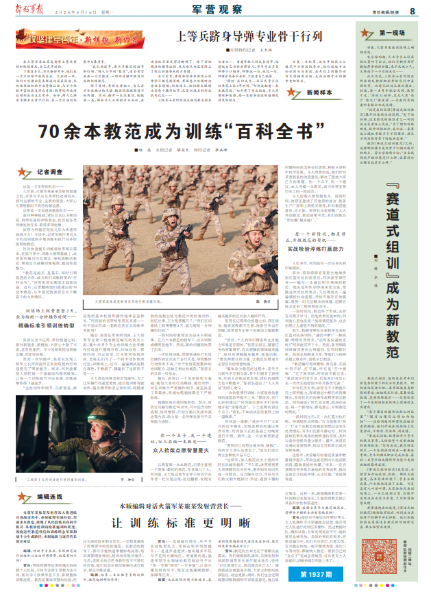 新賽道跑出加速度?!顿惖朗浇M訓(xùn)教范》被檢驗(yàn)有效后,何劍波與其他骨干的腳步并未停歇。他們依據(jù)檢驗(yàn)成果將這本教范繼續(xù)編修完善,供全旅官兵使用。