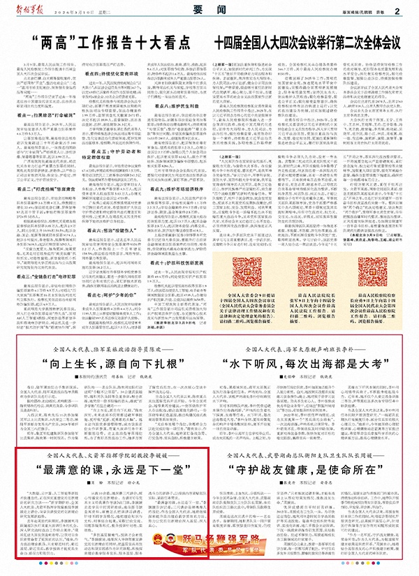 “最滿意的課,永遠(yuǎn)是下一堂?!崩铈骆赂嬖V記者,三尺講臺(tái)是鑄魂育人的戰(zhàn)位,作為全國(guó)人大代表,她將繼續(xù)探索提升政治理論教學(xué)質(zhì)效的方法,努力讓黨的創(chuàng)新理論深入基層、深入兵心。