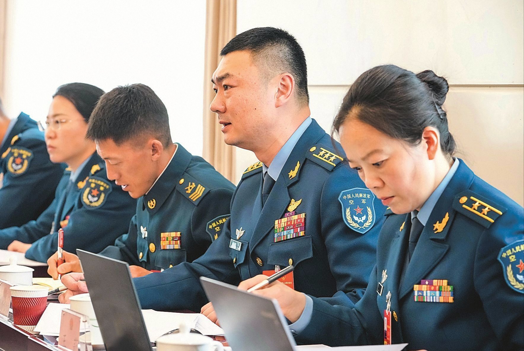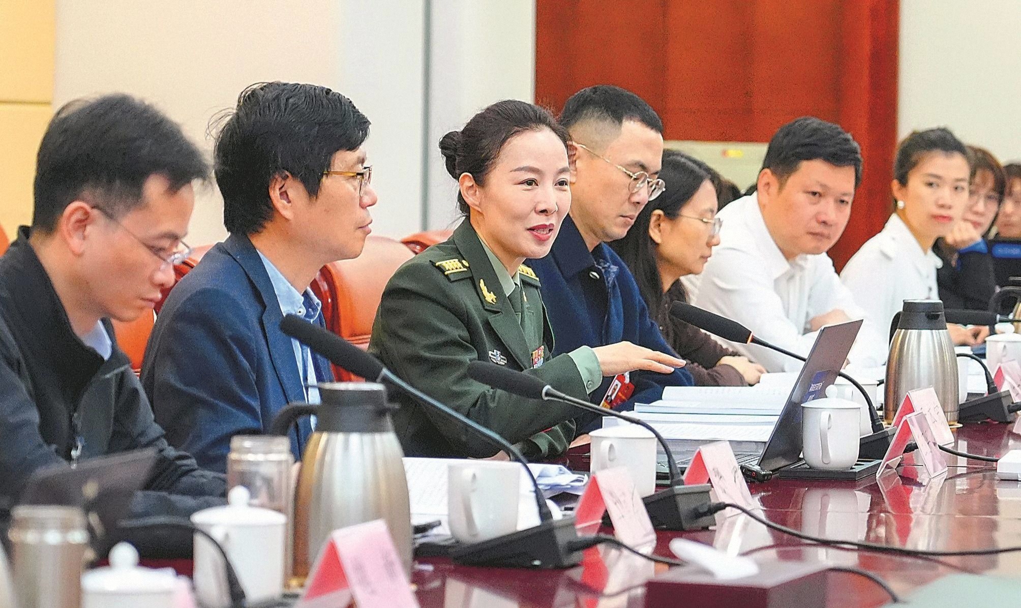 3月7日上午,在全國政協(xié)十四屆四次會(huì)議共青團(tuán)和青聯(lián)界別小組會(huì)議上,軍隊(duì)政協(xié)委員發(fā)言。解放軍報(bào)記者 劉妍 攝