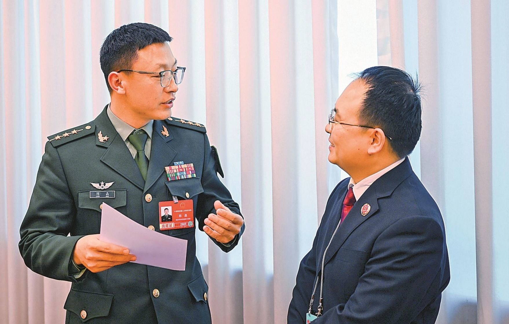 3月11日上午,解放軍和武警部隊(duì)代表團(tuán)舉行小組會(huì)議。圖為會(huì)議間隙,軍隊(duì)人大代表與列席會(huì)議的國家機(jī)關(guān)工作人員交流。解放軍報(bào)記者 穆瑞林 攝
