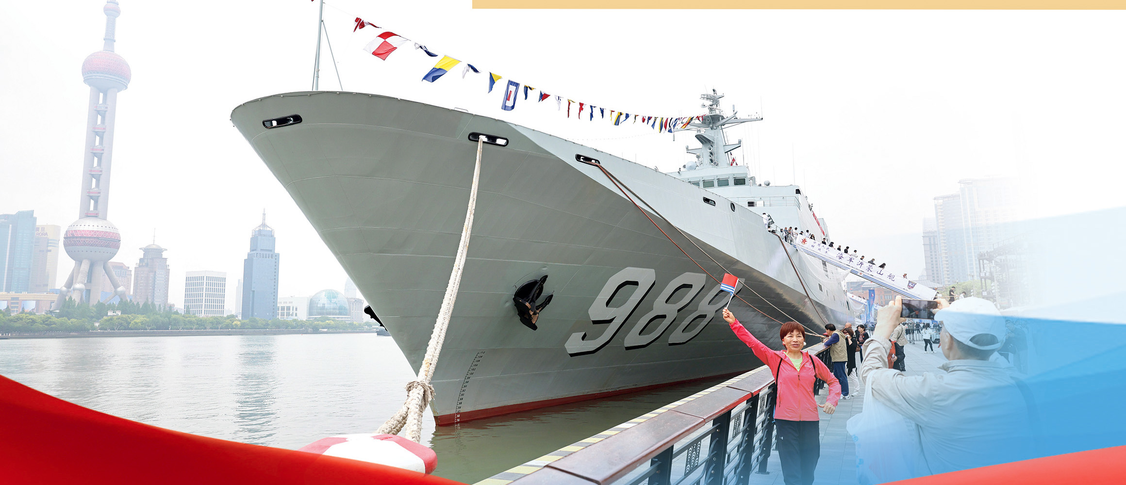 駐滬部隊與上海市雙擁辦組織艦艇開放活動,參觀者拍照留念。
