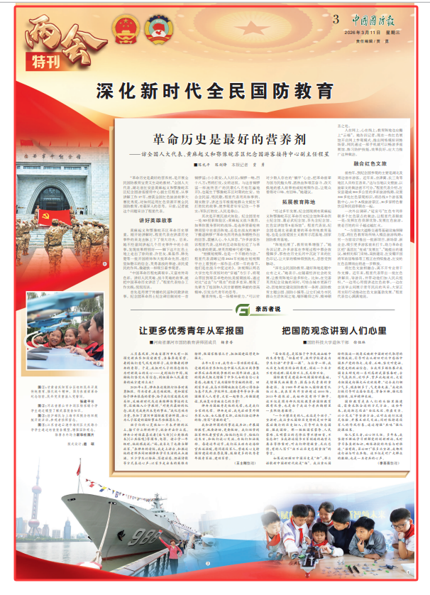 “深化全民國防教育,建好陣地是題中應(yīng)有之義。”她表示,應(yīng)隨著經(jīng)濟社會的發(fā)展,讓教育陣地日益多樣化。比如,在完善英烈紀念設(shè)施的同時,可結(jié)合城市更新行動,因地制宜建設(shè)國防教育一條街、國防教育主題公園、國防小鎮(zhèn)等,讓它們成為市民群眾生活休閑之地、緬懷瞻仰之所、精神朝圣之處。