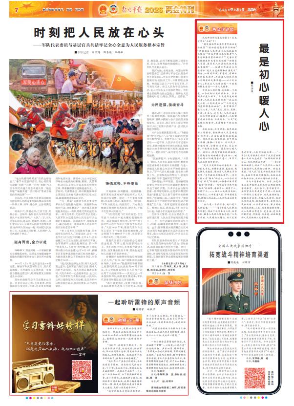 “我們是工農(nóng)的子弟,我們是人民的武裝……”一首《中國人民解放軍軍歌》,唱出了我軍來自人民、依靠人民、服務(wù)人民的立場和態(tài)度;“人民子弟兵,人民囑托記得清,為人民服務(wù)是宗旨,人民幸福我光榮……”一首《人民子弟兵》,唱出了我軍官兵服務(wù)人民的矢志追求;“祖國的利益重如山,為民甘灑血和汗……”一首《愛國奉獻歌》,唱出了人民軍隊一切為了祖國和人民的初心使命。對我軍來說,“為人民”是永不褪色的赤子情懷、永遠不變的價值指向、永恒追求的奮斗目標、永不枯竭的動力源泉。