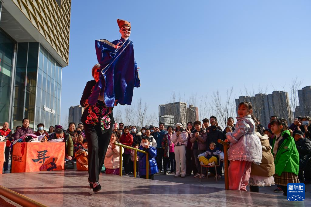 2月7日,游客在活動(dòng)現(xiàn)場觀看木偶戲表演。