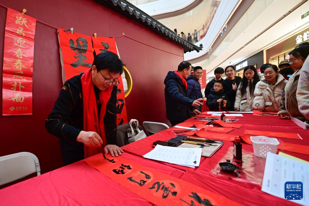 2月7日,書法家在活動(dòng)現(xiàn)場為游客寫春聯(lián)。