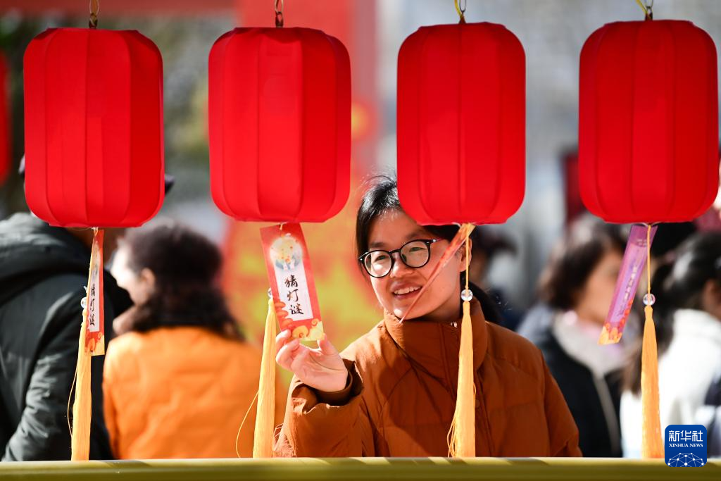 2月7日,游客在活動(dòng)現(xiàn)場參與猜燈謎游戲。