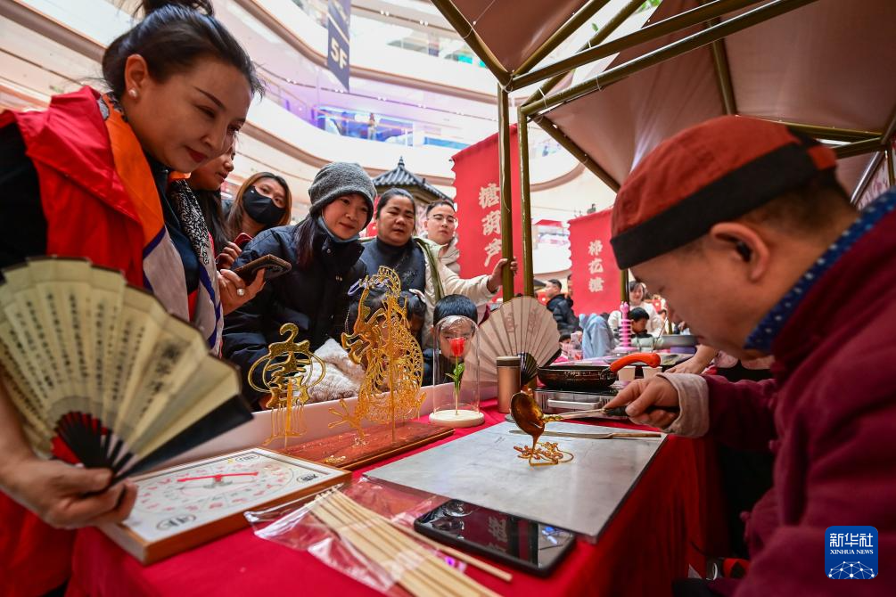 2月7日,游客在活動(dòng)現(xiàn)場觀看糖畫制作。