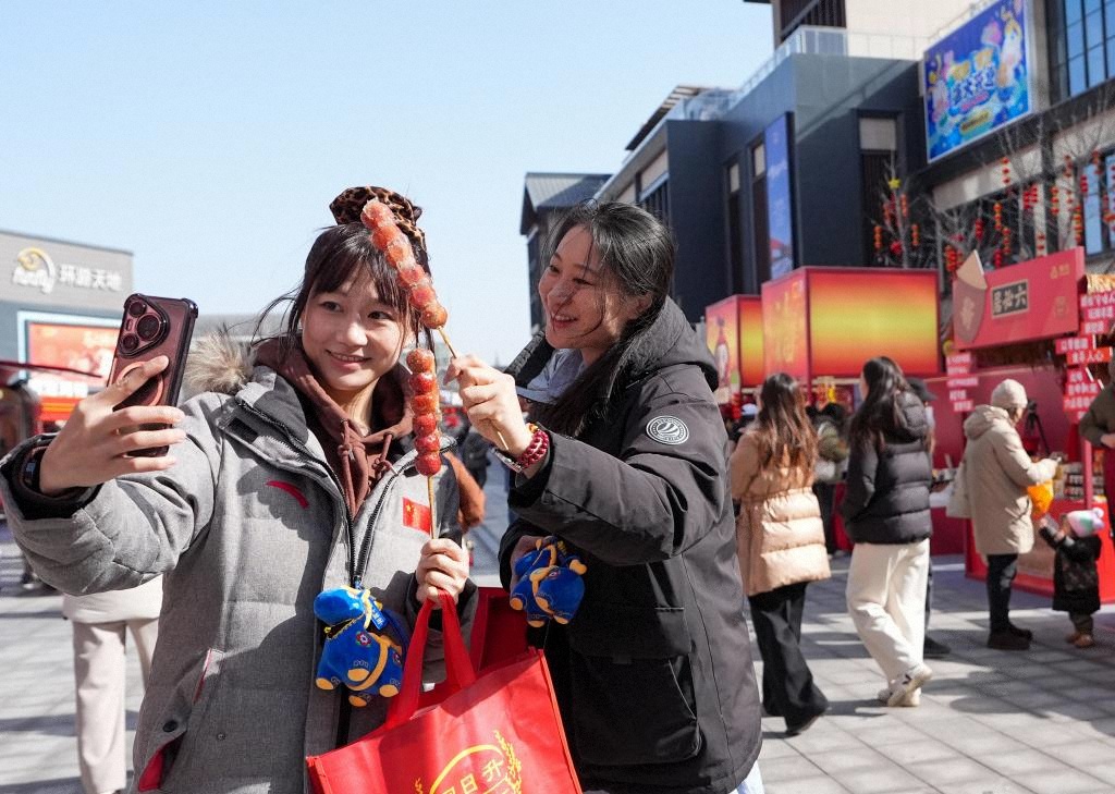 2月12日,在北京市東城區(qū)2026隆福寺新春市集,兩位游客拿著剛剛購買的冰糖葫蘆自拍留念。