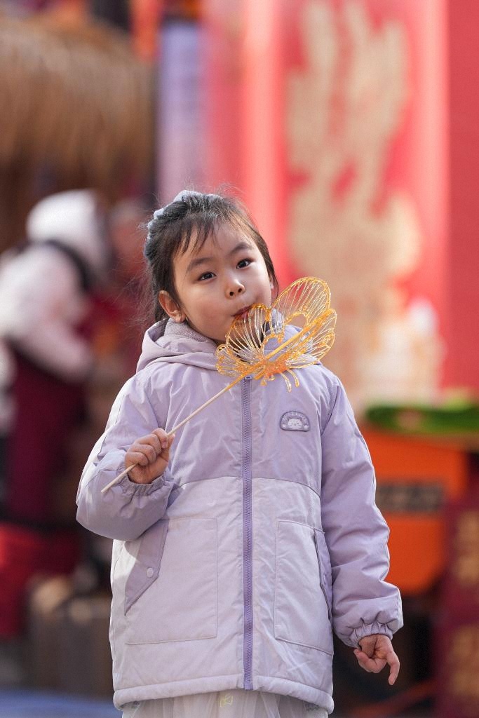 2月12日,一名小朋友在北京市東城區(qū)2026隆福寺新春市集吃糖畫。新華社記者 鞠煥宗 攝