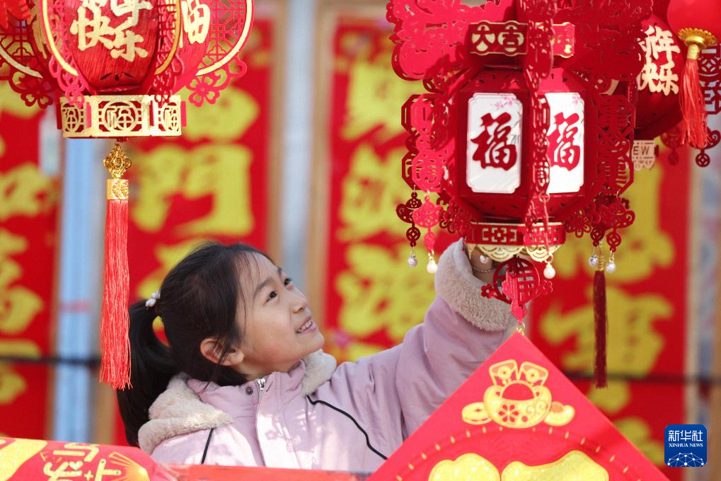 2月13日,在山東省臨沂市郯城縣郯城街道年貨市場(chǎng),小朋友在選購春節(jié)飾品。新華社發(fā)(張春雷攝)