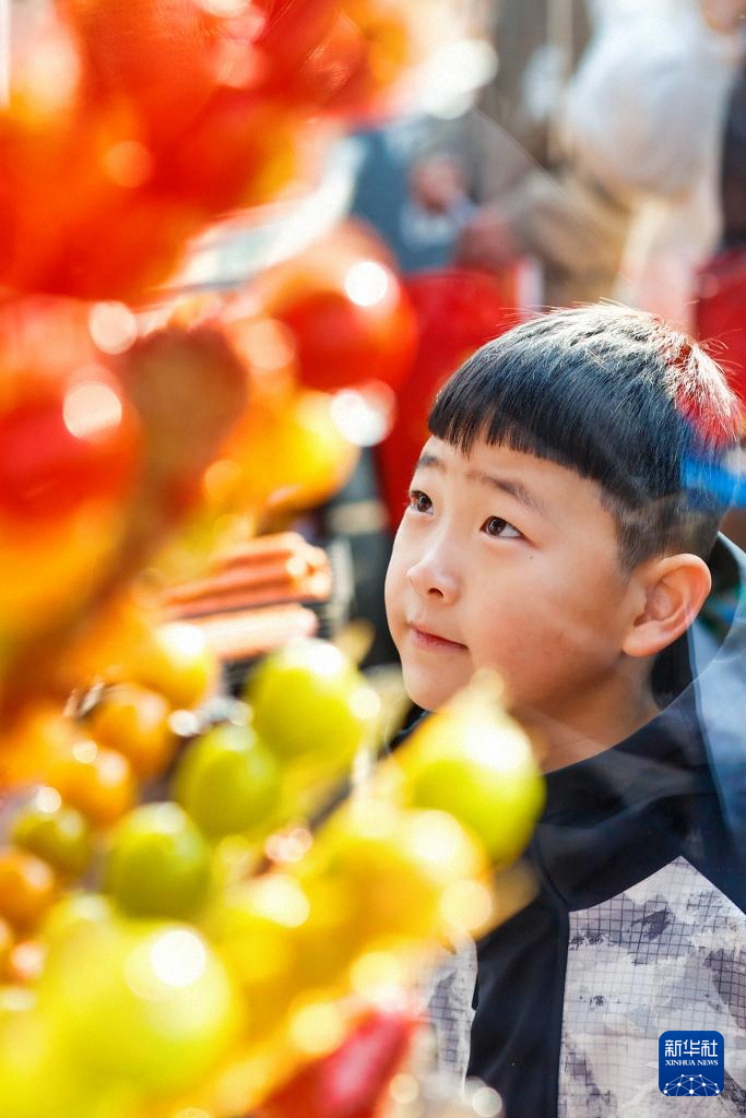 2月10日,小朋友在天津蘆臺(tái)大集上購買冰糖葫蘆。新華社發(fā)(杜鵬輝攝)