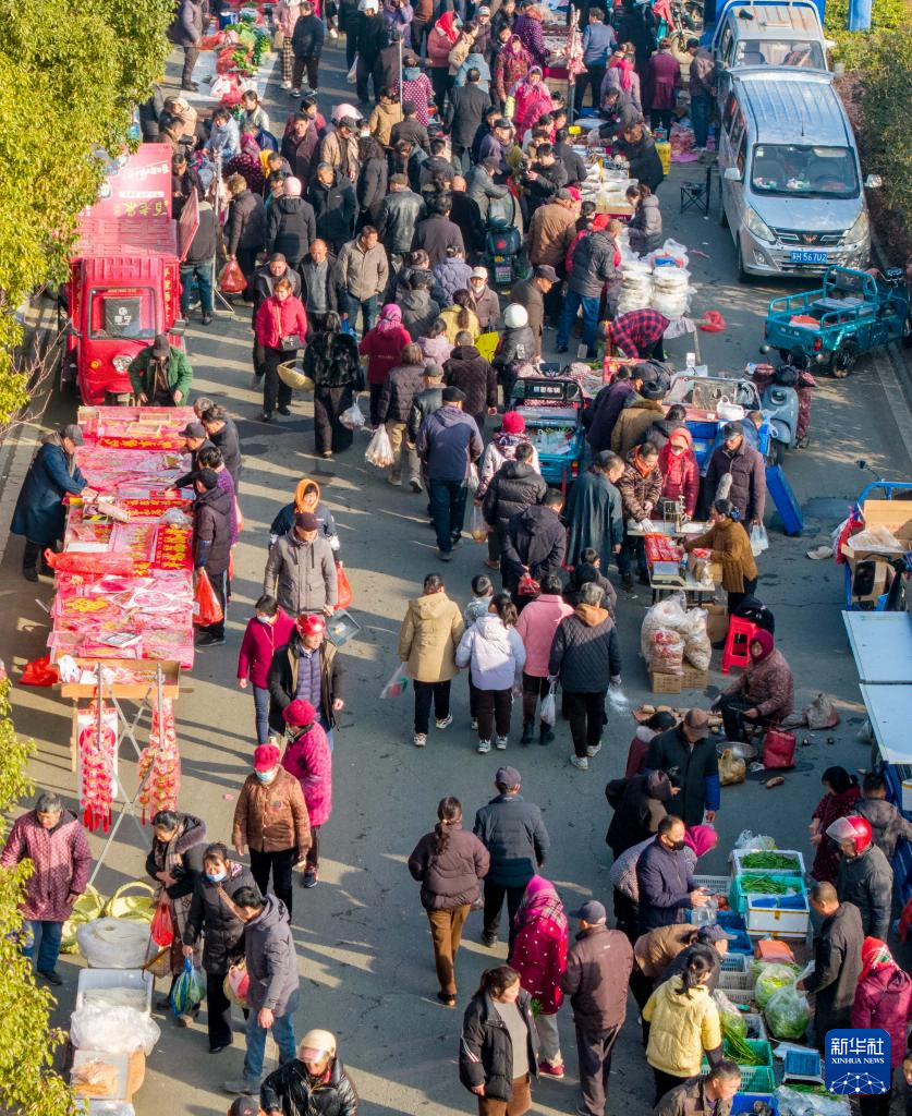 2月12日,在江蘇省揚(yáng)州市湯汪街道的年貨大集,市民在選購年貨(無人機(jī)照片)。新華社發(fā)(孟德龍攝)