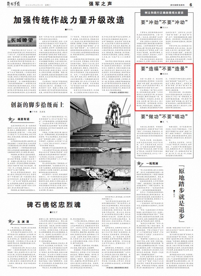 軍隊是要打仗的。真正的政績,從來不是鏡頭前的光鮮,而是官兵心里的認可;不是一時一事的熱鬧,而是強軍備戰(zhàn)的底蘊。軍隊黨員干部當摒棄“造景”的浮躁心態(tài),堅守“造?!钡臑槊癯跣?,始終聚焦強軍所需、官兵所盼,真抓實干、埋頭苦干,不斷把強軍事業(yè)推向前進。