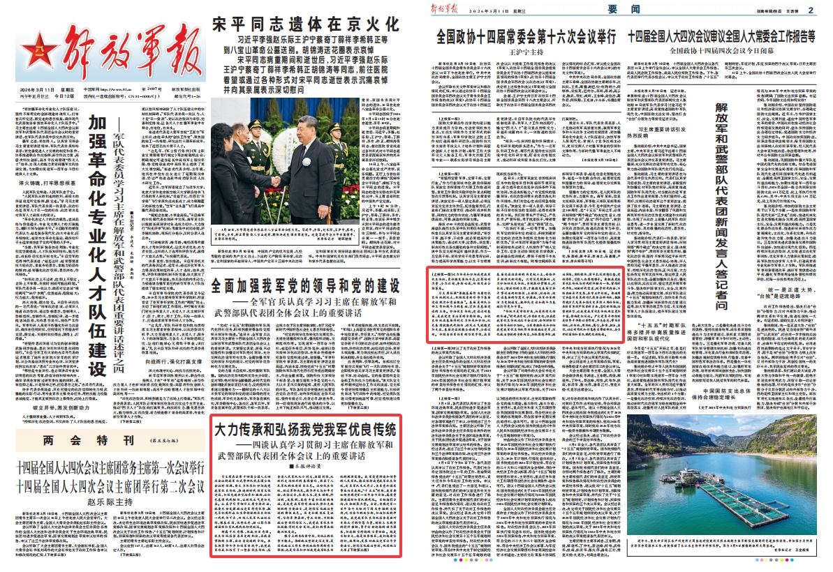 習(xí)主席在出席十四屆全國人大四次會議解放軍和武警部隊(duì)代表團(tuán)全體會議時(shí)強(qiáng)調(diào),要大力傳承和弘揚(yáng)我黨我軍優(yōu)良傳統(tǒng),推進(jìn)新時(shí)代強(qiáng)軍文化建設(shè),加強(qiáng)先進(jìn)典型培養(yǎng)和激勵(lì),讓紅色基因代代相傳,讓新風(fēng)正氣更加充盈。認(rèn)真學(xué)習(xí)貫徹習(xí)主席重要講話,就要充分發(fā)揮政治建軍特有優(yōu)勢,把先輩們用鮮血和生命鑄就的優(yōu)良傳統(tǒng)一代代傳下去,確保人民軍隊(duì)血脈永續(xù)、根基永固、優(yōu)勢永存,凝心聚力推動國防和軍隊(duì)現(xiàn)代化行穩(wěn)致遠(yuǎn)。
