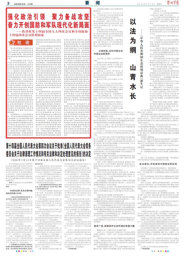 今年的全國兩會,是在“十五五”開局之年召開的重要會議。兩會的成功召開,對于鼓舞和動員全黨全軍全國各族人民更加緊密地團(tuán)結(jié)在以習(xí)近平同志為核心的黨中央周圍,萬眾一心、砥礪前行,奮力實(shí)現(xiàn)全年經(jīng)濟(jì)社會發(fā)展目標(biāo)任務(wù),確?!笆逦濉绷己瞄_局,不斷開創(chuàng)以中國式現(xiàn)代化全面推進(jìn)強(qiáng)國建設(shè)、民族復(fù)興偉業(yè)新局面,具有重要意義。政府工作報(bào)告全面貫徹習(xí)近平新時(shí)代中國特色社會主義思想,深入貫徹黨的二十大和二十屆歷次全會精神,認(rèn)真落實(shí)四中全會部署,客觀全面總結(jié)成績,圍繞推進(jìn)中國式現(xiàn)代化謀篇布局,是一個(gè)高舉旗幟、向強(qiáng)開新、團(tuán)結(jié)奮進(jìn)的好報(bào)告。審議通過的生態(tài)環(huán)境法典、民族團(tuán)結(jié)進(jìn)步促進(jìn)法、國家發(fā)展規(guī)劃法,為新時(shí)代國家立法標(biāo)注新的刻度。軍隊(duì)人大代表、政協(xié)委員以強(qiáng)烈的政治責(zé)任感和飽滿的政治熱情參會議政,扭住打好實(shí)現(xiàn)建軍一百年奮斗目標(biāo)攻堅(jiān)戰(zhàn),圍繞推進(jìn)政治建軍、深化政治整訓(xùn)、聚力練兵備戰(zhàn)、加強(qiáng)軍事治理等建言獻(xiàn)策,展現(xiàn)了良好形象和精神風(fēng)貌。