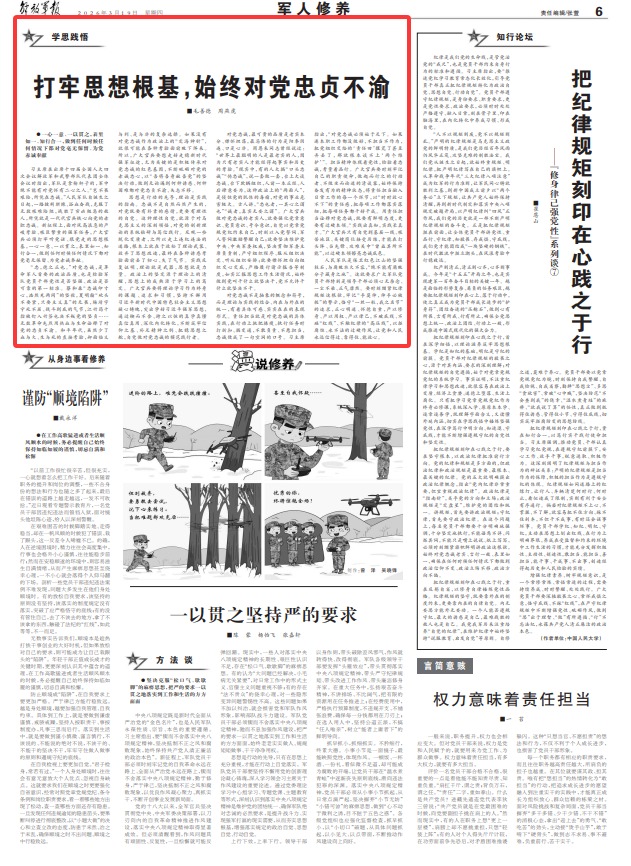 習主席在出席十四屆全國人大四次會議解放軍和武警部隊代表團全體會議時指出,軍隊是拿槍桿子的,軍中絕不能有對黨懷有二心之人。“豈不畏艱險,所憑在忠誠?!比嗣褴婈犠哉Q生之日起,一路披荊斬棘、浴血奮戰(zhàn),克服了無數(shù)艱難險阻,戰(zhàn)勝了窮兇極惡的敵人,所憑就是一代代官兵鐵心向黨的赤膽忠誠。新征程上,面對風高浪急的嚴峻考驗、艱巨繁重的強軍任務(wù),廣大官兵必須打牢聽黨話、跟黨走的思想根基,一心一意、一以貫之,表里如一、知行合一,做到任何時候任何情況下都對黨毫無保留、為黨赤誠奉獻。