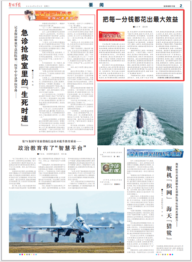 習(xí)主席出席十四屆全國人大四次會(huì)議解放軍和武警部隊(duì)代表團(tuán)全體會(huì)議時(shí)強(qiáng)調(diào),要推進(jìn)軍費(fèi)預(yù)算管理改革,搞好軍費(fèi)供需動(dòng)態(tài)平衡,強(qiáng)化經(jīng)費(fèi)使用全鏈條管控和績(jī)效評(píng)估,把每一分錢都用在刀刃上。學(xué)習(xí)貫徹這一重要論述,要求全軍各級(jí)發(fā)揚(yáng)“節(jié)約每一個(gè)銅板”的精神,珍惜和用好寶貴的經(jīng)費(fèi)資源,把有限的財(cái)力充分轉(zhuǎn)化為戰(zhàn)斗力。